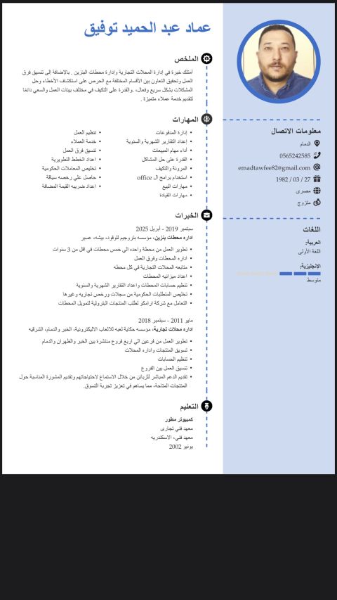 خبرة 6 أعوام في مجال ادارة محطات الوقود وتشغيلها معرفة تامة بمتطلبات المحطة والمنشاءات الخاصه بداخل. المحطة. ومتابعه فرق العمل والحسابات والمخزون الرئيسي للبنزين واحتياجاتها واجراءات السلامة المطلوبه