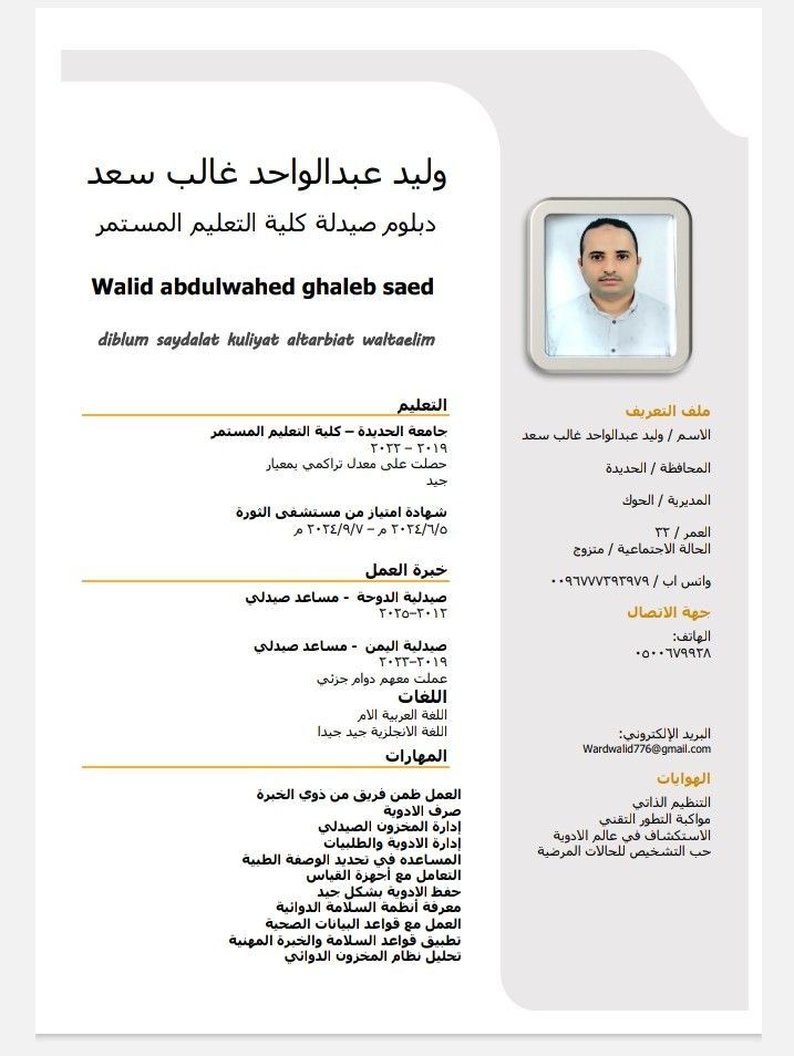 ابحث عن عمل أجيد التعامل مع الزبائن وا أجيد التعامل مع الكمبيوتر وا أجيد التكيف مع التطوير التقني عملت في مجال الصيدلة لمد 13 عامل كمساعد صيدلي وصارف ادوية مبيعات ومتابعات صلاحيتها وادخال البضائع الجديد في نضام الكاشير ورصها وتشخيص المرضى حاصل على دبلوم صيدلية حاصل على شهادة امتياز من مستشفى الثورة في الحديده حاصل على شهادة عمل من صيدلية اليمن عمل بدوام جزئي وحاصل على شهادة عمل من صيدلية الدوحة