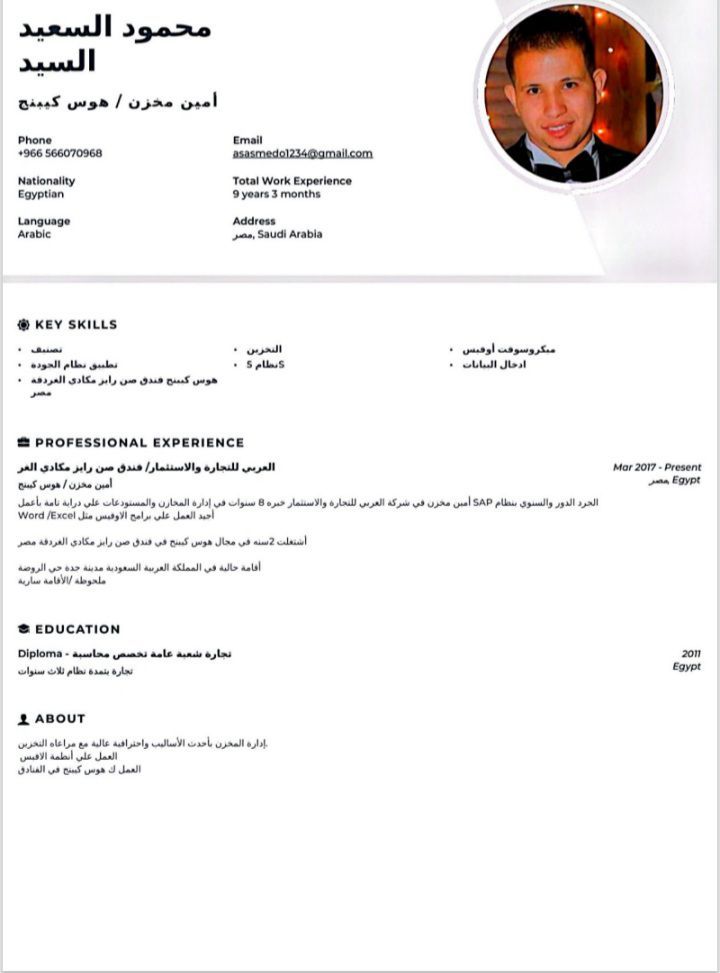أمين مخازن ومستودعات خبرة 8 سنوات في المجال تحضير شحنات صرف واستلام بضائع اجادة استخدام برامج الأوفيس اجادة العمل تحت أي ضغط تنميط وتصنيف المخزن بنظام 5S العمل علي نظام Sap ادارة مخازن دورات تدريبية في إدارة المخازن والمستودعات العمل ضمن تيم أو تيم ليدر حل المشكلات إن وجدت ابتكار حلول لتصنيف المخزن والعمل علي نهضة ونظافة المكان