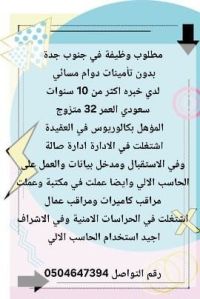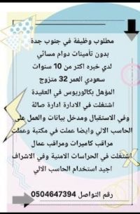 مطلوب وظيفة في جنوب جدة بدون تأمينات دوام مسائي لدي خبرة أكثر من 10 سنوات سعودي العمر 32 متزوج المؤهل بكالوريوس في العقيدة اشتغلت في الادارة ادارة صالة وفي الاستقبال ومدخل بيانات والعمل على الحاسب الآلي وأيضا عملت في مكتبة وعملت مراقب كاميرات ومراقب عمال اشتغلت في الحراسات الأمنية وفي الاشراف أجيد استخدام الحاسب الآلي رقم التواصل