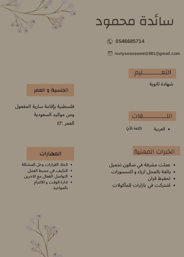 ابحث عن وظيفة باليومية أو شهري إقامة سارية ومن مواليد السعودية مدينة جدة السكن حي المنار للتواصل واتساب على الرقم الموضح بالاعلان والارسال على الايميل