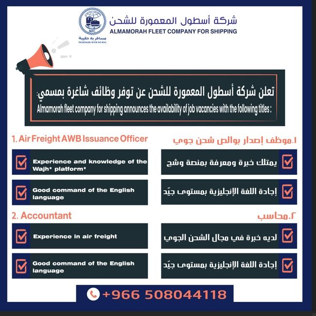 تعلن شركة أسطول المعمورة الشحن في جدة حي الجوهرة عن وجود شاغر وظيفي في الآتي يفضل من ونقل كفالة المطلوب للتوظيف في جدة موظف اصدار بوألص شحن جوي يمتلك خبرة ومعرفة بمنصة وشج واجادة اللغة الانجليزية بمستوى جيد