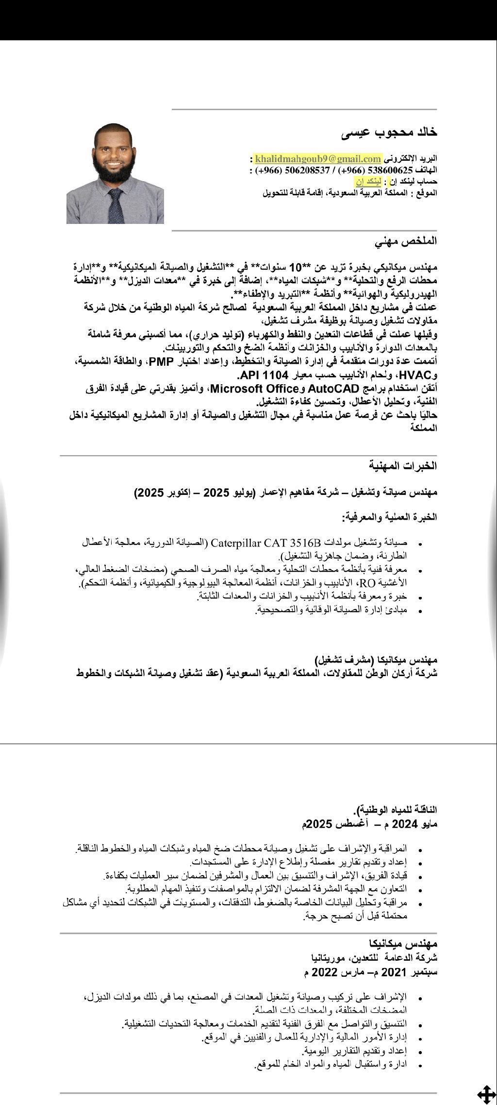 مهندس ميكانيكا بخبرة 10 سنوات في إدارة وتشغيل وصيانة الأنظمة الميكانيكية في قطاعات المياه التعدين النفط والغاز، توليد الطاقة، والتصنيع عملت كمشرف تشغيل لشركة مقاولات تعمل لصالح شركة المياه الوطنية السعودية NWC سنة وثلاث شهور، وعملت بمحطة تنقية ومولدات وأتمتع بخبرة واسعة في أنظمة الهواء المضغوط، الهيدروليك، المضخات، التوربينات، السلامة من الحرائق، وأنظمة التكييف. مسجل في الهيئة مشارك، رخصة قيادة