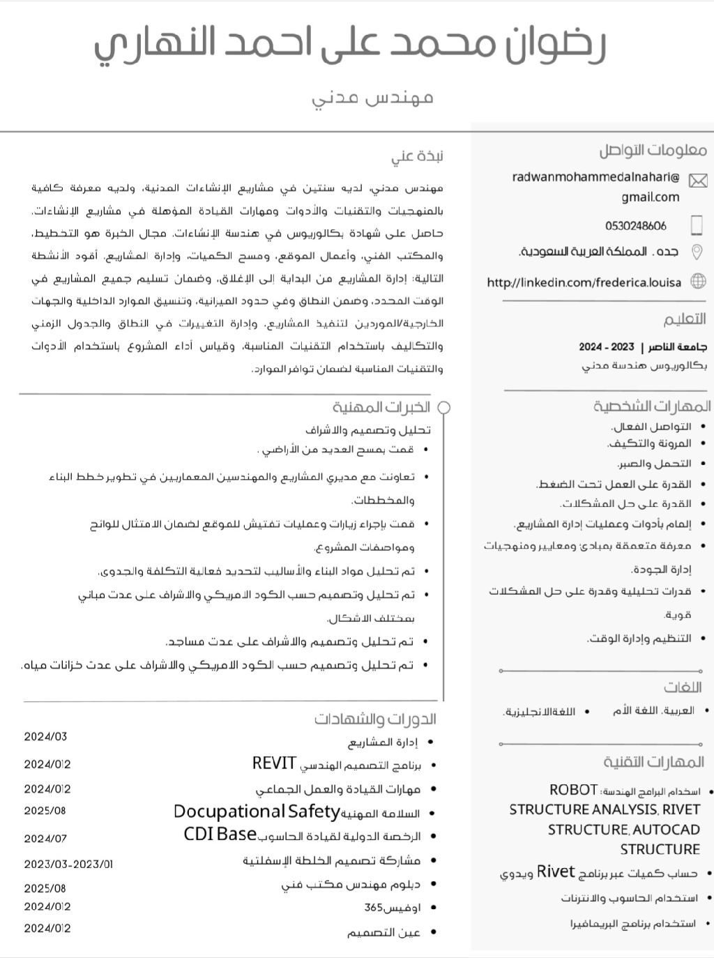 مهندس مدني، لديه سنتين في مشاريع الإنشاءات المدنية، ولديه معرفة كافية بالمنهجيات والتقنيات والأدوات ومهارات القيادة المؤهلة في مشاريع الإنشاءات. حاصل على شهادة بكالوريوس في هندسة الإنشاءات مجال الخبرة هو التخطيط، والمكتب الفني، وأعمال الموقع