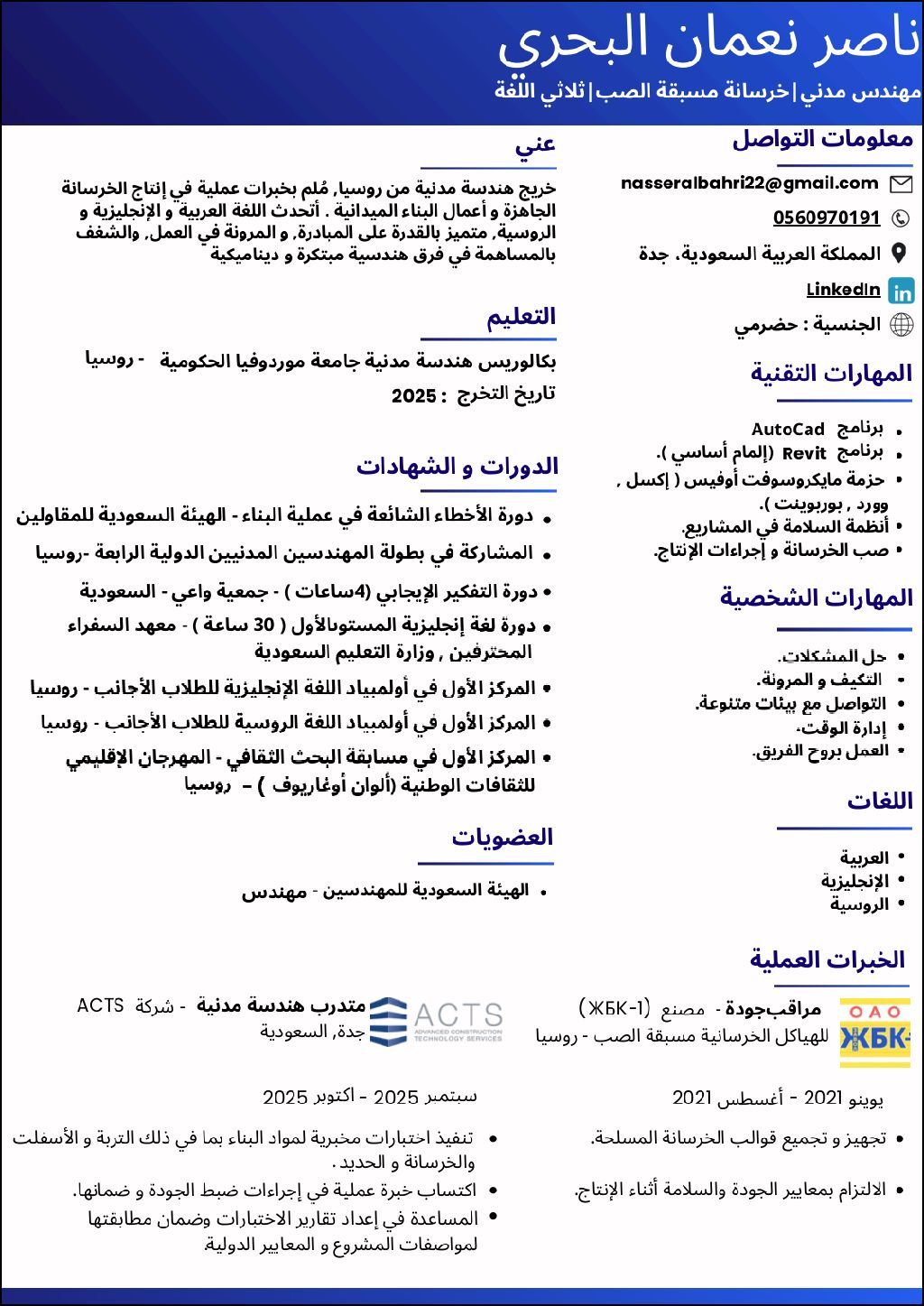 مهندس مدني حديث تخرج من روسيا وعضو في هيئة المهندسين، ابحث عن فرصة عمل في جدة أو أي مدينة داخل المملكة. حاصل على بكالوريوس هندسة مدنية، ولدي خبرة في العمل في روسيا في شركة خرسانة مسبقة الصب، ولدي تدريب في مختبرات ACTS لاختبارات المواد الانشائية، ملم ببرنامج التصميم AutoCAD ولدي رغبة كبيرة في تطوير مهاراتي واكتساب خبرة عملية