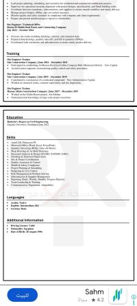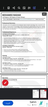 مهندس مدني خريج جامعة الزقازيق خبرة سنة بالمملكة في أعمال الاشراف بالمواقع علي أعمال الخرسانات والتشطيبات وأعمال الحصر واعداد الجداول الزمنيه وابحث عن فرصة عمل