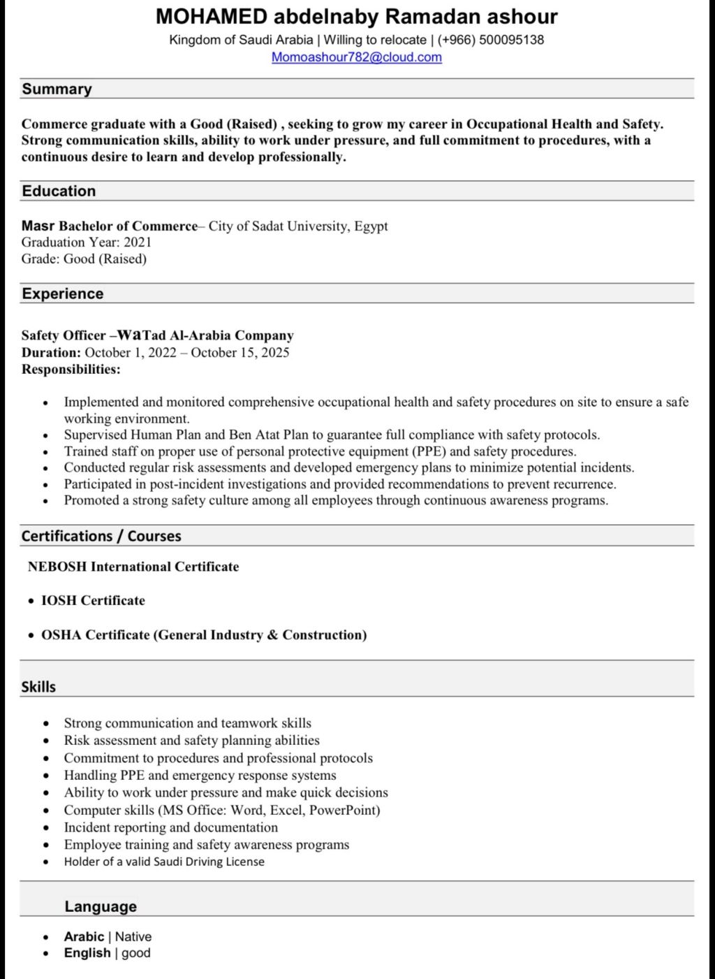 مسؤول أمن وسلامه خبرة 3 سنوات حاصل علي شهادة النيبوش الدوليه وشهادة الايوش والاوشا صناعات عامة وانشاءات ابحث عن فرصة عمل مناسبة