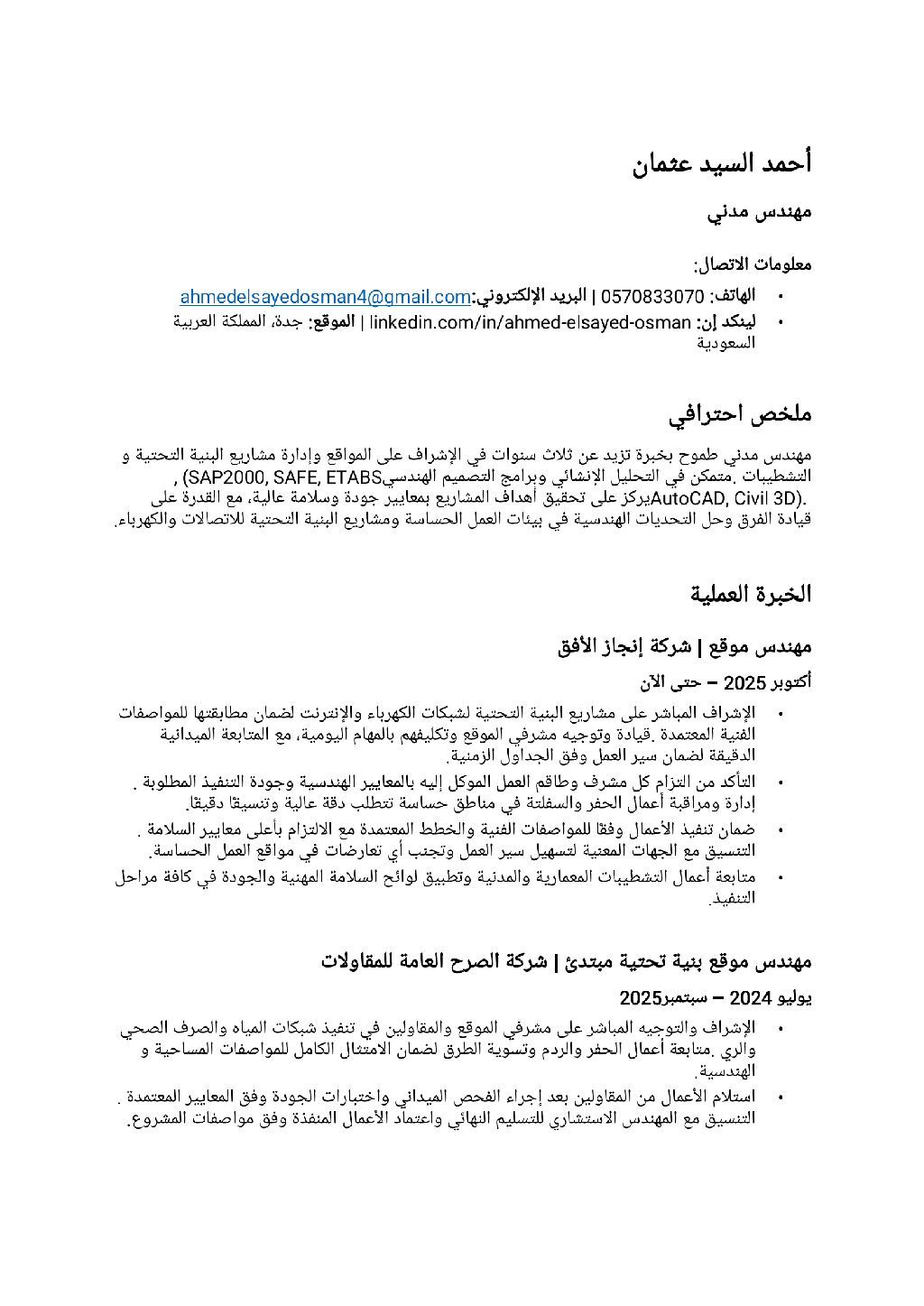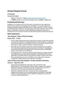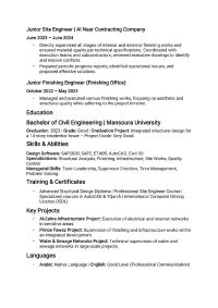 مهندس مدني موقع خبرة في التشطيبات والبنية التحتية المشاريع البارزة (من الأحدث الى الأقدم) مشروع البنية التحتية لحي الزهراء تنفيذ شبكات الكهرباء والانترنت في مناطق حساسة، مع الالتزام بمعايير الجودة والسلامة. مشروع الأمير فواز تنفيذ ومتابعة أعمال التشطيبات والبنية التحتية المتكاملة، وضمان تسليم الأعمال وفق المواصفات الفنية. مشروع شبكات المياه والصرف الصحي - مصر المشاركة في تنفيذ شبكات مياه