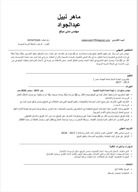 رغبتي في شغل وظيفة مشرف مدني. لدي خبرة واسعة في الاشراف على المواقع، وتنسيق القوى العاملة، وتنفيذ الأعمال المدنية وفقا للرسومات المعتمدة، ومعايير الجودة، ولوائح السلامة. تجدون سيرتي الذاتية مرفقة للاطلاع عليها. ارحب بفرصة مناقشة مدى ملاءمتي لهذا المنصب. مع خالص التحيات، مالك افتخار عوان مشرف مدني