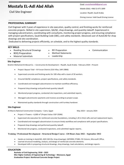 Civil Engineer with 9 years of heavy experience in housing, roads, asphalt, site development and landscape works. Delivered major projects in Riyadh including King Abdulaziz Park and Rabiah Al - Ahsa Housing. Strong on site, fast problem - solving, clear coordination, and solid cost/ time/ quality control. Boost productivity. Ready to join immediately