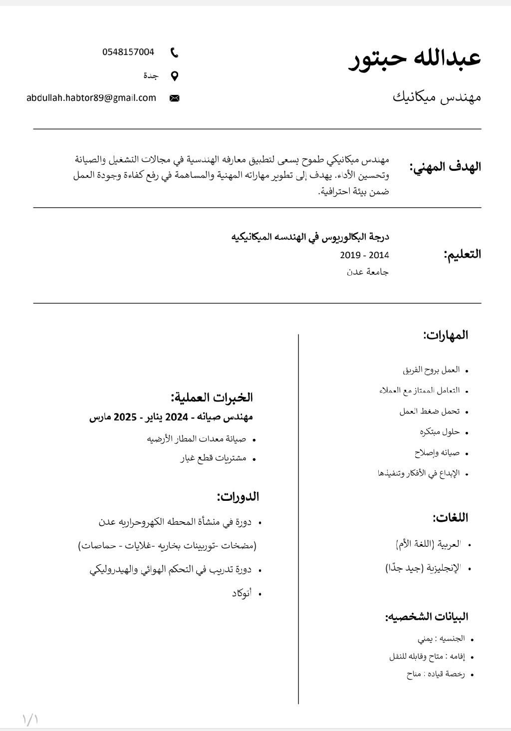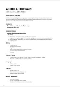بكالوريوس هندسة ميكانيك / مهندس ميكانيكي بخبرة في صيانة معدات المطار الأرضيه والصيانة العامة. ابحث عن عمل يتيح لي استخدام مهاراتي وتطوير معرفتي العلمية والعملية في بيئة عمل محفزة. قابل للعمل والتعلم لأي مجال آخر ذي صله