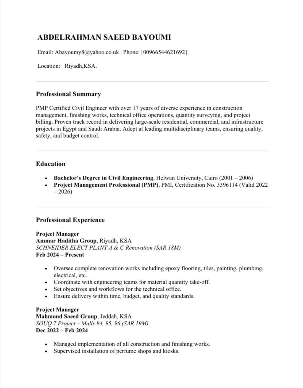مطلوب وظيفة أنا مهندس مدني خبرة 18 عام منهم 16 عام في السعودية - حاصل علي شهادة PMP - اشتغلت في المشاريع الكبيرة في المملكة (كليات تقنية ومشاريع وزارة الداخليه KAP1 ومشاريع المديرية العامة للسجون ومشاريع درء مخاطر السيول والأمطار التابعه لشركة المياه ومشاريع استثمارية تابعه لجهات متعددة ابحث عن فرصة عمل مدير مشروع أو مدير تنفيذ أو مهندس مكتب فني شامل (تقارير + مستخلصات