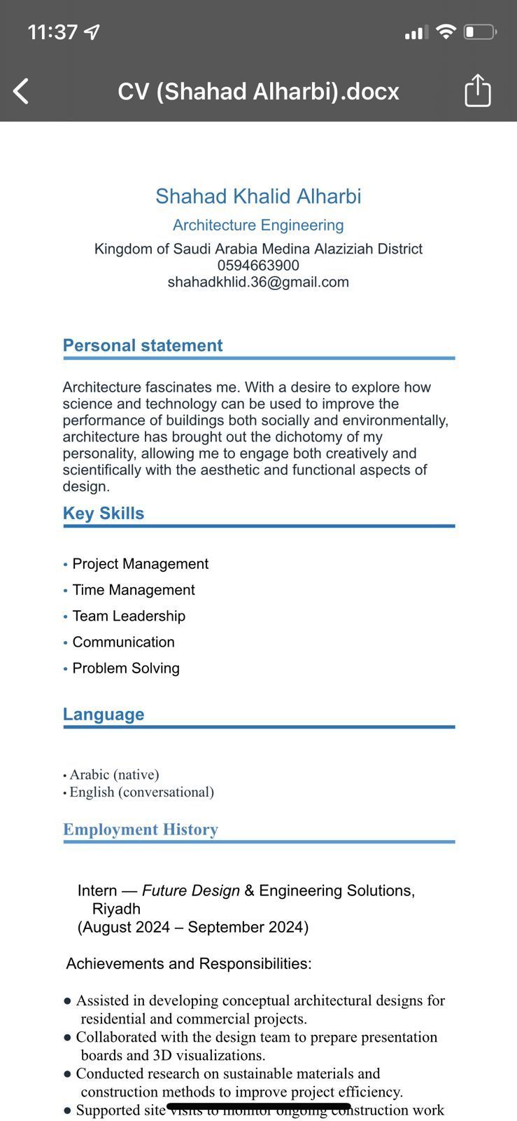 I am an architecture engineering student at Prince Muqrin bin Abdulaziz University in Madinah, and I am almost done. I am looking any chance in the field of architecture to continue learning, gain experience, and enhance my talents. I am proficient in design and planning using architectural design software