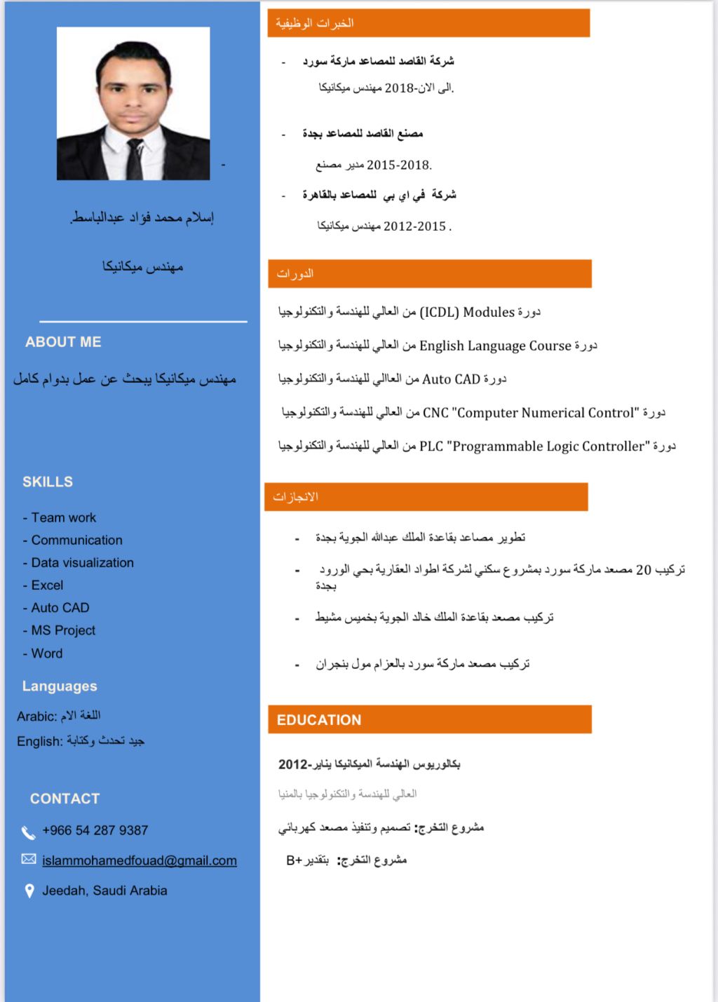 أنا مهندس اسلام محمد فؤاد مهندس ميكانيكا حاصل على اعتماد الهيئة الهندسية السعودية خبرة أكثر من 9 أعوام في مجال المصاعد والسلالم أرغب في العمل لدى شركتكم الموقرة للاستفادة من مهاراتي الفنية والشخصية للعمل على تطوير وتحقيق أهداف الشركة ومرفق السيرة الذاتية الخاصة بي مقيم في جدة إقامة قابلة للنقل رخصة قيادة سارية على استعداد للعمل فورا والانتقال الى أي مكان Dear Hiring