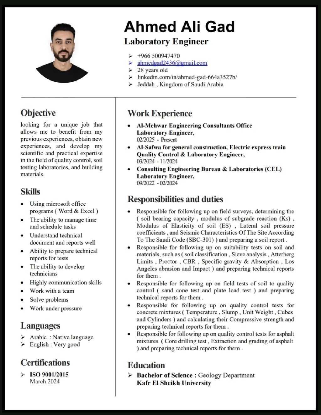 مهندس جيولوجي خبرة 4 سنوات منهم سنة في السعودية ابحث عن عمل متواجد في جدة جاهز لنقل الكفالة ضبط جودة الخرسانة والاسفلت والمواد وخبرة في الجسات واعداد التقارير الجيوتقنيه للتواصل