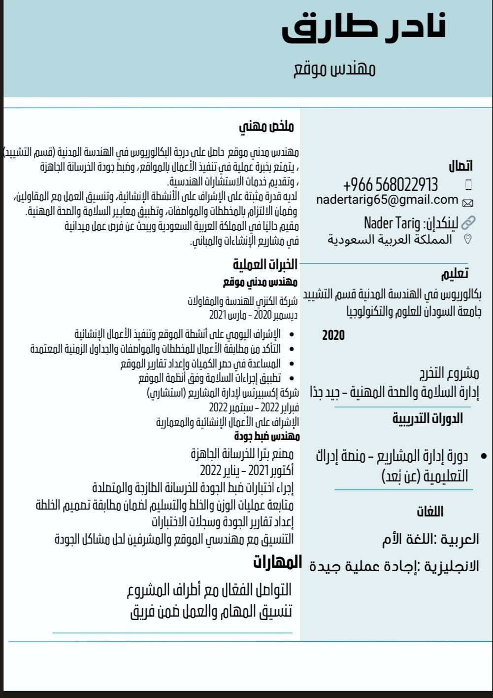 مهندس مدني خريج 2020. ساعي على عمل في مجال التنفيذ والاشراف. المام بطريقه التنفيذ وفق المخططات ومتابعه الأعمال وعمل التقارير الفنيه الموضحه لسير عمل