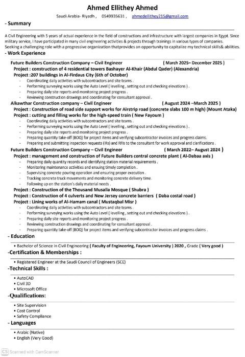مهندس محمد عبد الناصر سعد مهندس مدني لدي خبرة فعلية تمتد لأكثر من 11 عاما في أعمال الإنشاءات والبنية التحتية وأعمال الصرف الصحي والمياه ومحطات معالجة مياه الصرف الصحي، عملت مسبقا كمساعد مدير تنفيذي، لدي خبرة بمراجعة المخططات التنفيذية وخبرة في إدارة فريق العمل وضبط الجودة بالموقع، ولدي اقامة نظامية، اعتماد هيئة المهندسين، حاصل علي شهادة أل PMP