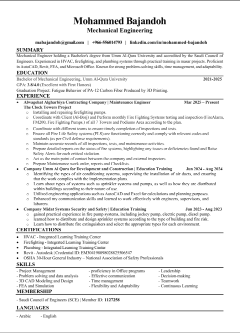 مهندس ميكانيكا خريج جامعة حكومية، حاصل على عضوية الهيئة السعودية للمهندسين خبرة في مجال المقاولات ومكافحة الحريق والتصميم والصيانة والتشغيل والتنفيذ في المشاريع وحصر الكميات وقراءة المخططات وعمل المستخلصات وتسليم المواقع، حاصل على شهادة دولية الأوشا ولدي رخصة قيادة وإقامة سارية (لا مانع لدي بالعمل في أي منطقة في السعودية)