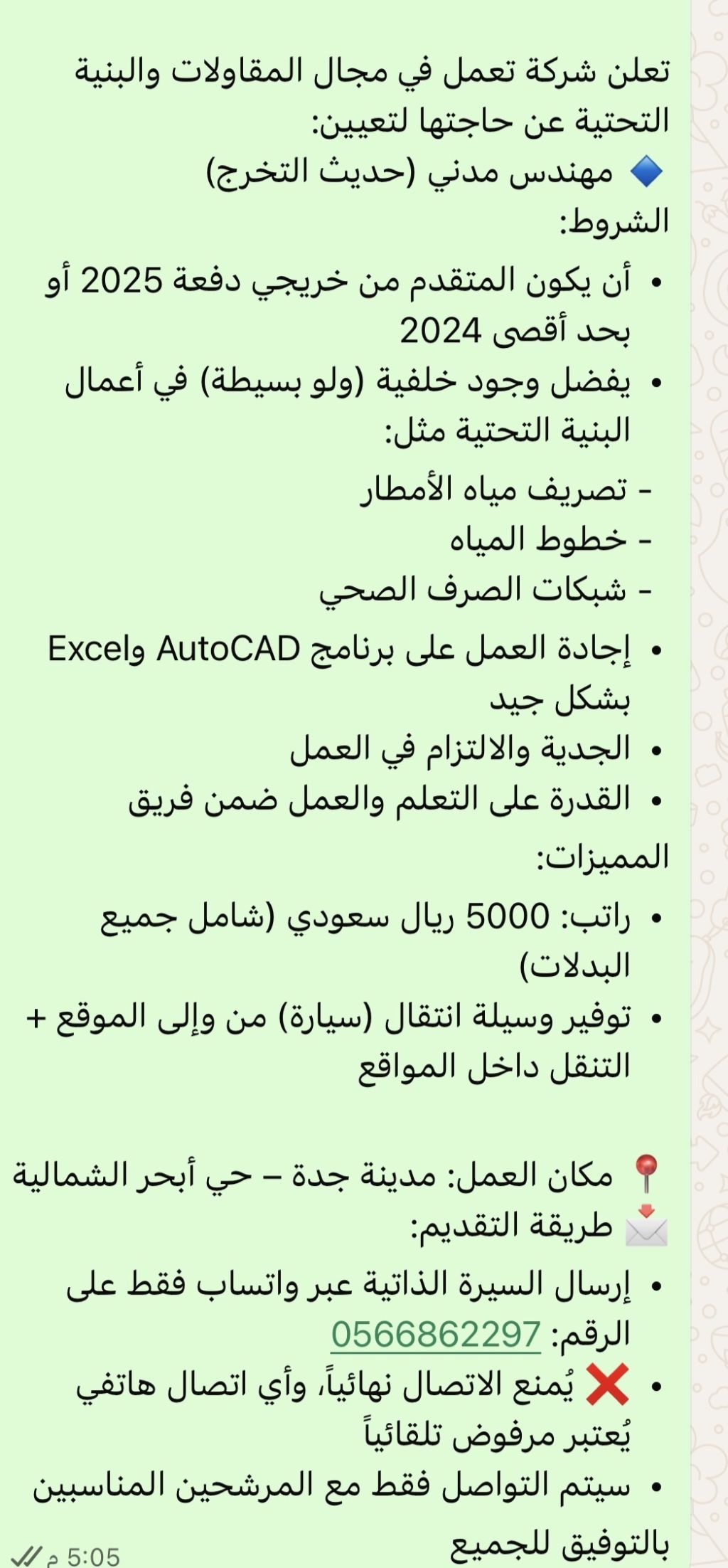 مطلوب مهندس مدني حديث التخرج بتقدير جيد على الأقل خريج دفعه 2025 أو 2024 بحد أقصى، يفضل من لديه خبرة ولو بسيطة في أعمال البنيه التحتية ويجيد جدا استخدام AutoCAD وExcel, المميزات الراتب 5000 ريال شامل جميع البدلات وسيتم توفير التنقل من قبل الشركة الى المواقع ومحل اقامته، الرجاء من تتوفر فيه الشروط يرسل السيرة الذاتية على الواتساب فقط ويمنع الاتصال نهائيا سواء هاتفيا، حي أبحر الشمالية