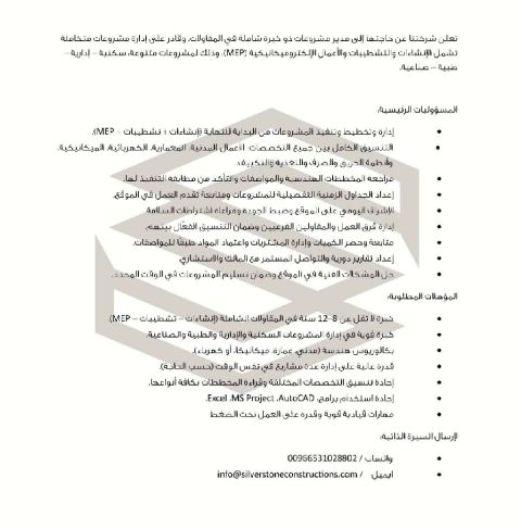 تعلن شركتنا في منطقة مكة المكرمة بمدينة جدة حي الفيصلية عن حاجتها الى مدير مشروعات ذو خبرة شاملة في المقاولات، وقادر على إدارة مشروعات متكاملة تشمل الإنشاءات والتشطيبات والأعمال الإلكتروميكانيكية (MEP) وذلك لمشروعات متنوعة سكنية - ادارية - طبية - صناعية