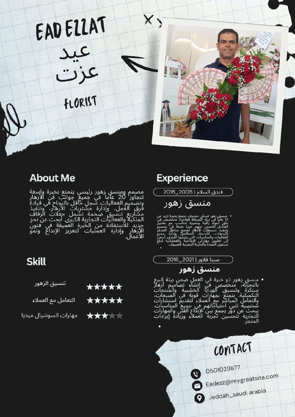الاسم/ عيد عزت منسق ورود طبيعي وصناعي (أفراح. بوكيهات. بانشات. حفلات) خبرة 20 عام مصري الجنسية مقيم في جدة استعداد للعمل في أي من مناطق المملكة
