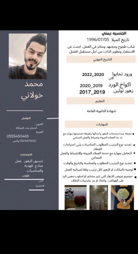 منسق ورد وهدايا وحفلات خبرة 6 سنوات من الجنسية اليمنيه خبرة في ادارة المحلات والتعامل مع العملاء وترتيبات المحل وتنظيمه ابحث عن فرصة عمل