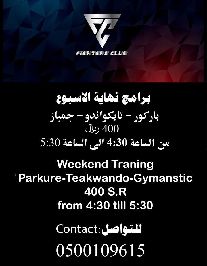 جاهز تكسر الروتين وتبدأ بالحركة انضم لبرامج Fighters Club المميزة بار كور تايكواندو zwj جمباز كل نهاية أسبوع من 4:30 الى 9:00 مساء فقط ب 400 ريال لي أحداء الرياضات جميع الفئات العمرية بيئة آمنة ومدربين محترفين للحجز والاستفسار خلك من النخبة. خلك من أل Fighters