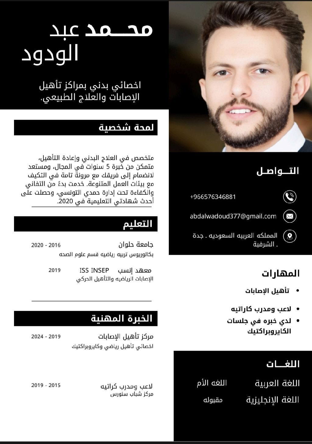 متخصص في العلاج البدني واعادة التأهيل، متمكن من خبرة 5 سنوات في المجال، ومستعد لانضمام الى فريقكم مع مرونة تامة في التكيف مع بيئات العمل المتنوعة. حصلت على أحدث شهادتي التعليمية في 2020. لدي الجدية للاتصال والتفاعل مع ثقافات وخبرات متنوعة، والقدرة على المساهمة في تحقيق أهداف الشركة. انضما مي لفريقكم سيعزز حقق نجاحاته الكبيرة والمتجددة