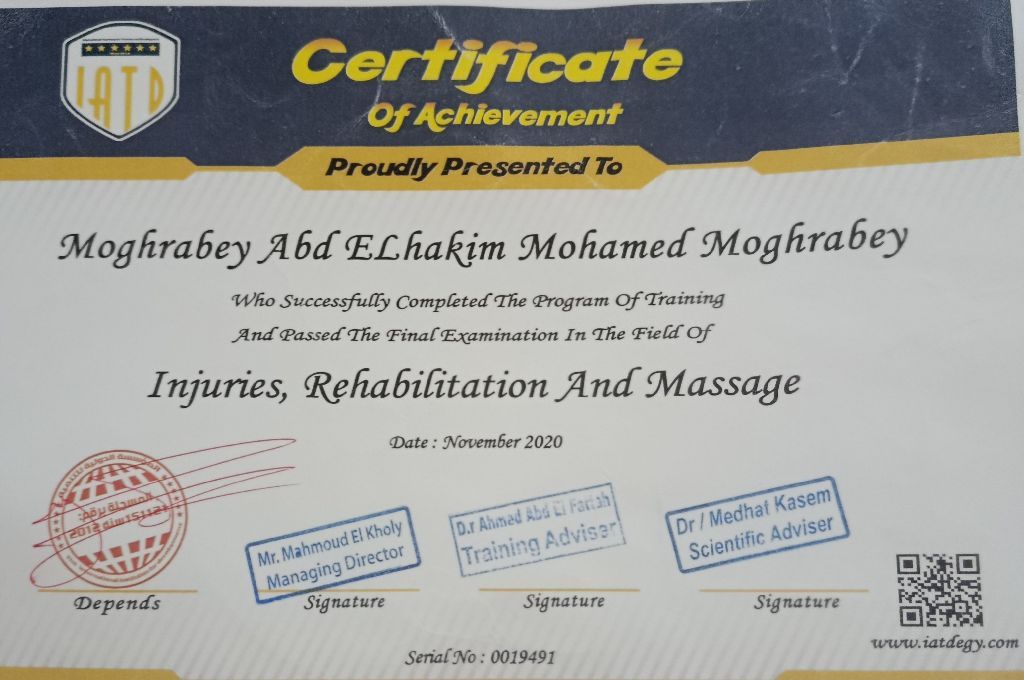 أخصائي جميع أنواع المساج وعلاج طبيعي والاصابات والتأهيل وحاصل على شهادة معتمدة ولدي شهادة خبرة في أحد المراكز