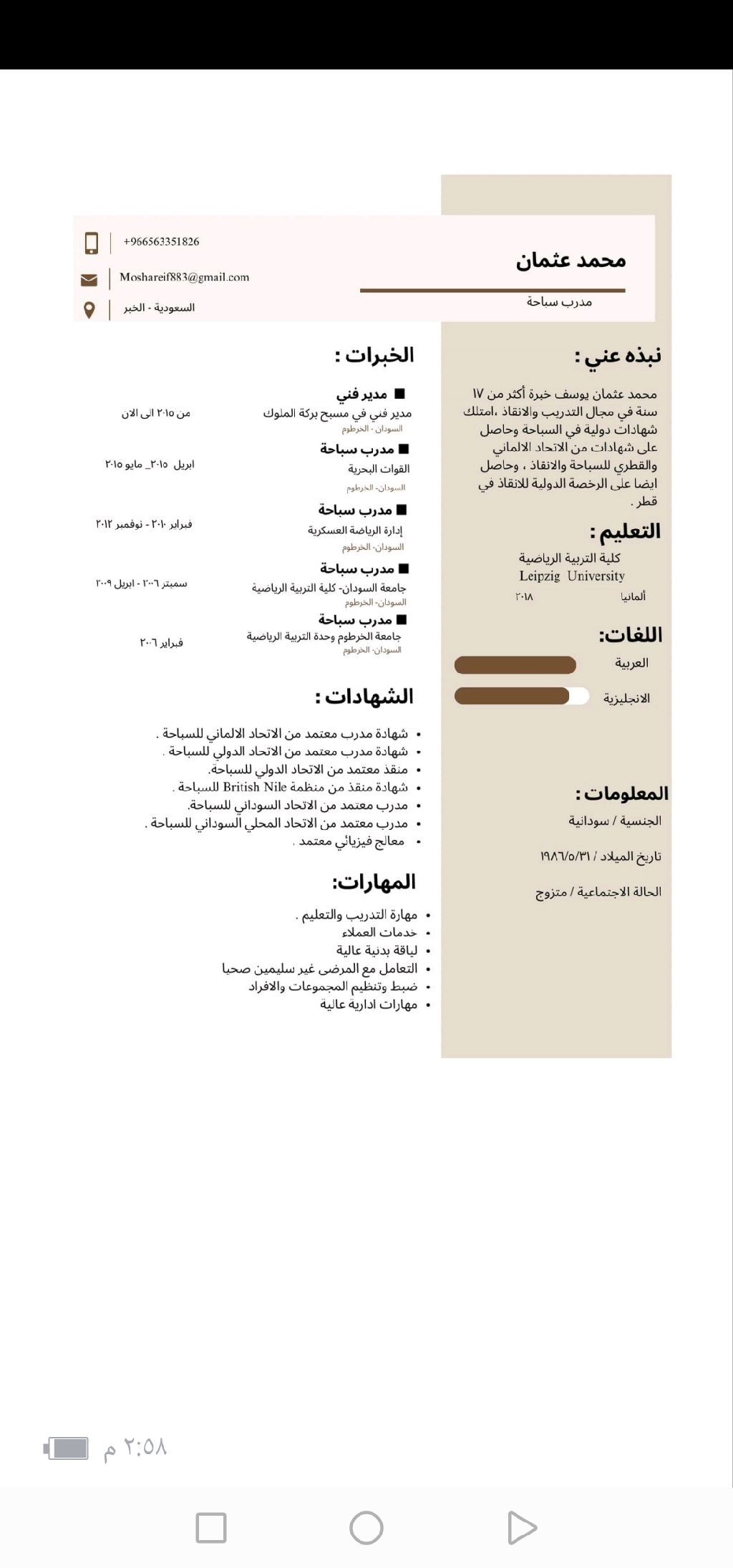مدرب ومنقذ سباحة معتمد دوليا من الاتحاد الدولي للسباحة والاتحاد الألماني للسباحة والعلاج المائي مقيم تدريب جميع المراحل داخل المملكة. المكان جدة