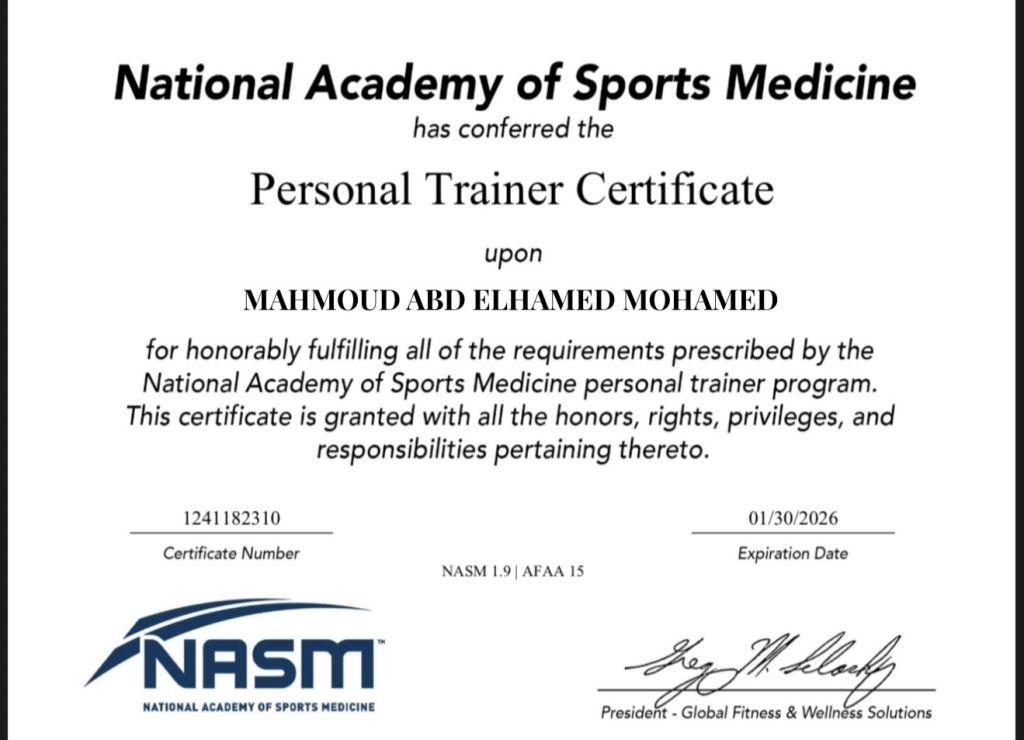 أنا كابتن محمود، 23 سنة، بكالوريوس تربية رياضية، جامعة المنصورة خريج دفعة 2024، مدرب شخصي معتمد من أكاديمية National Academy of Sports Medicine, مدرب ملاكمة ولاعب مسجل بمنتخب مصر سابقا مدرب لياقة بدنية، وأدور وظيفة، متواجد في جدة، منقلتش إقامة من قبل متواجد حاليا زيارة
