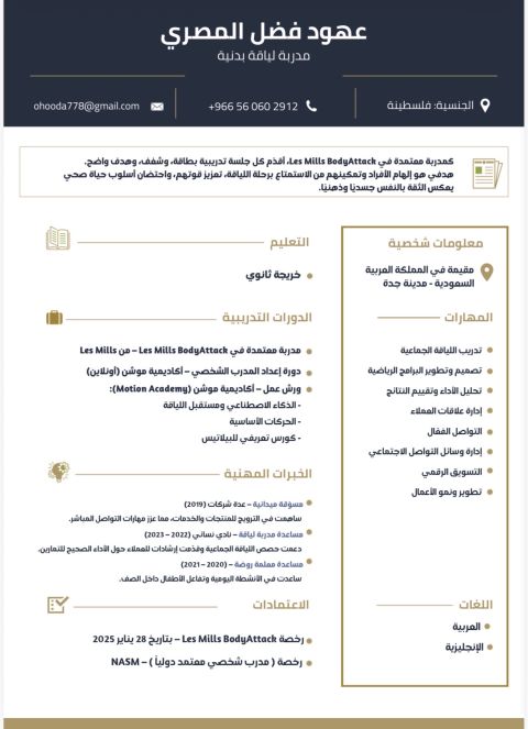 معكم جمال حسين عطية عبد اللطيف ماجستير في علوم الرياضة وحاصل على العديد من الكورسات والدورات المعتمده دوليا ومحليا مثل Nasam ولدى الكثير من الخبرة في مجال العمل. اتمنى من حضراتكم الاطلاع على السيرة الذاتية لأنني ابحث عن فرصة عمل. وتقبلوا تحياتي لكم جميعا