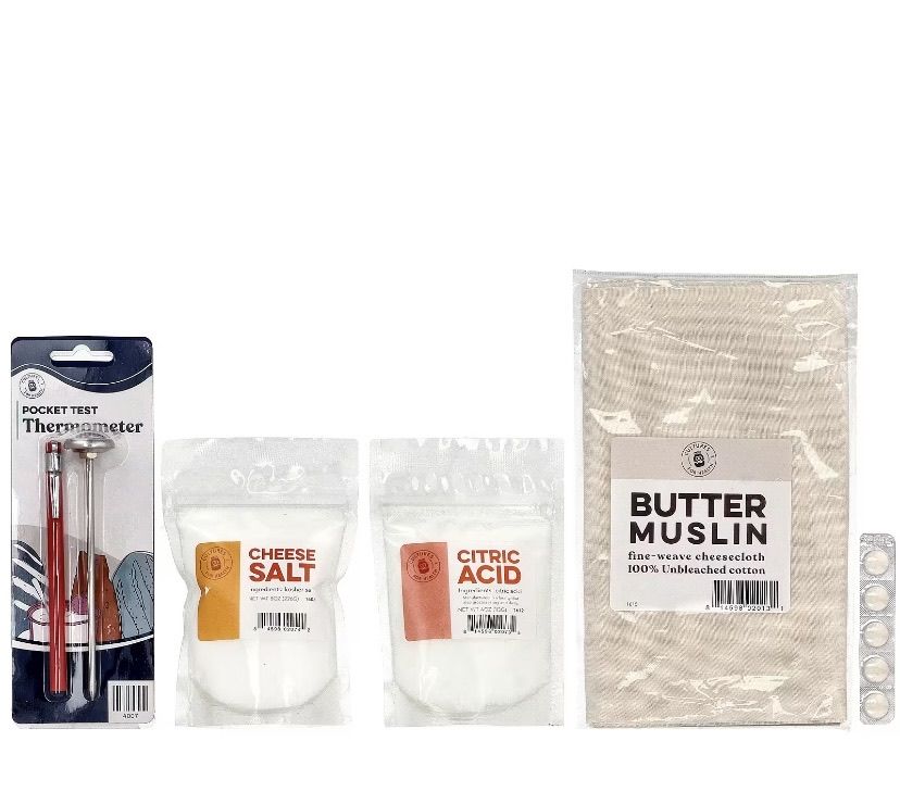 مجموعة صناعة الجبنه الموزاريلا والريكوتا مقياس حرارة 1 يا ردة من الشاش الزبدي 4 أونصات من حمض الستريك 5 أقراص منفحة نباتية 8 أونصات ملح جبن كتيب التعليمات والوصفات