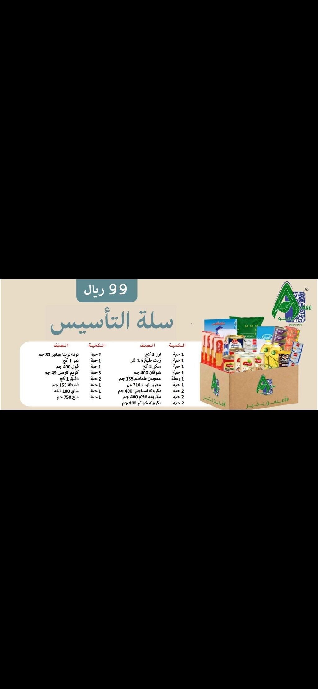 1 حبة رز 3 كج 1 حبة زيت دلال 1.5 لتر 1 حبة سكر 2 كج 1 حبة شوفان 400 جيم 1 ربطة معجون طماطم 135 جيم 1 حبة عصير توت 710 مل 2 حبة مكرونه اسباجتي 400 جيم 2 حبة مكرونه أقلام 400 جيم 2 حبة مكرونه خواتم 400 جيم 2 حبة تونه تريفا صغير 80 جيم 1 حبة تمر 1 كج 1 حبة فول 400 جيم 3 حبة كريم كار ميل 49 جيم 2 حبة دقيق 1 كج 1 حبة قشطة 155 جيم 1 حبة شاي 100 فتلة