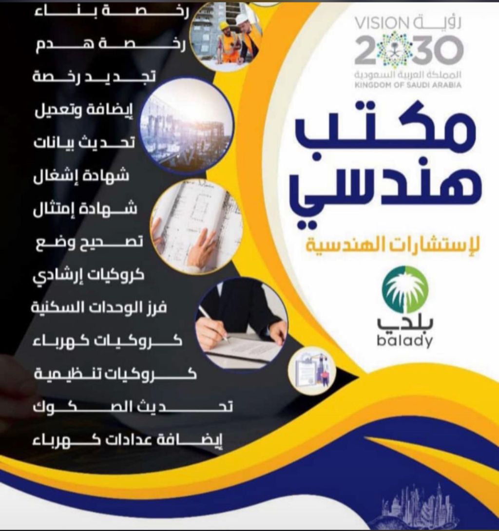 نقوم باستخراج جميع رخص البناء (فيلا - عمارات سكنية - سكني تجاري - اداري - محطة وقود - مغسلة وخدمات سيارات) تقوم باستخراج جميع التقريرات المساحية (تحديث صك - تجزئة أرض - دمج أرض - رفع مساحي - توقيع أحداثيات) نقوم بفرزه العمارات السكنية بيان أحمال (تقوية عداد - تجزئة عداد - اضافة عداد) استخراج شهادات الأشغال (اتمام البناء) تصحيح وضع المباني المخالفه
