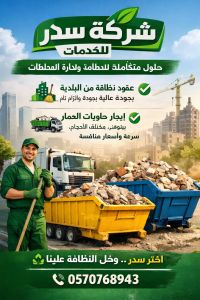 شركة سدر للخدمات حلول متكاملة للنظافة وإدارة المخلفات عقود نظافة معتمدة من البلدية بجودة عالية والتزام تام إيجار حاويات الدمار بمختلف الأحجام، سرعة في التنفيذ وأسعار منافسة اختر سدر وخل النظافة علينا للتواصل