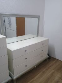 للبيع غرفة نوم أنيقة بتصميم عصري فاخر، بحالة ممتازة جدا، شبه جديدة. تتكون الغرفة من سرير كبير مع ظهر مبطن بتصميم راق ومريح دولاب واسع بباب سحاب مع مرآة كبيرة عدد (2) كومدينة جانبية عدد (1) كومدينة طولية تسريحة مع أدراج متعددة للتخزين ومنظر أنيق اللون أبيض لامع مع لمسات فضية تضيف لمسة فخامة للمكان. الخشب متين والتشطيب عالي الجودة، جاهزة للاستخدام الفوري دون أي ملاحظات. السعر مناسب وقابل للتفاوض البسيط