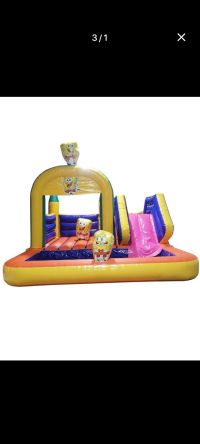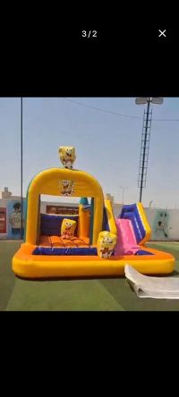 نطيطة هوائية مع زحليقة وحوض مائي على شكل سبونج بوب / الطول (5 متر) العرض (5 متر) الارتفاع (4 متر) السعر (600) لليوم الواحد