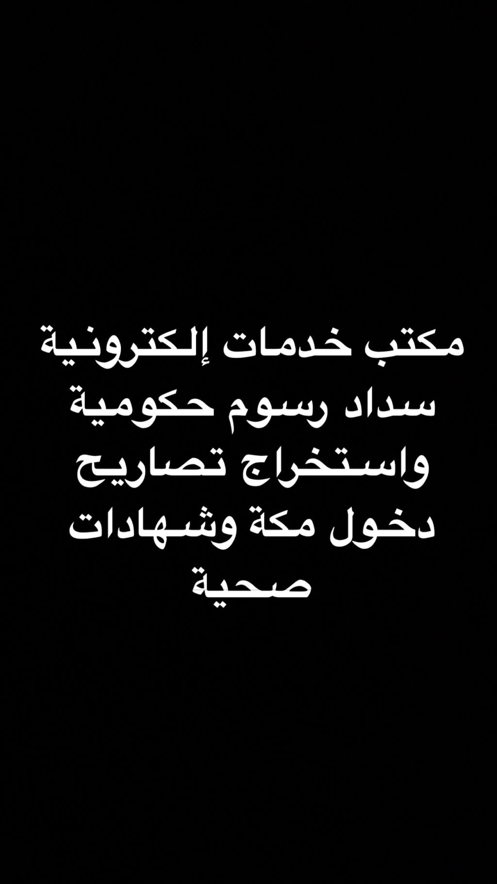 مكتب خدمات الكتروني لدينا جميع خدمات العامة من سدادات حكومية ومن نقل كفالة وما غيرها من خدمات ولدينا استخراج تصاريح دخول مكة وأيضا استخراج شهادات صحيه موحده ثلاث سنوات حق العمال للمطعام والكافيهات والبقالات والمؤسسات في جميع مناطق المملكة الرجاء التواصل