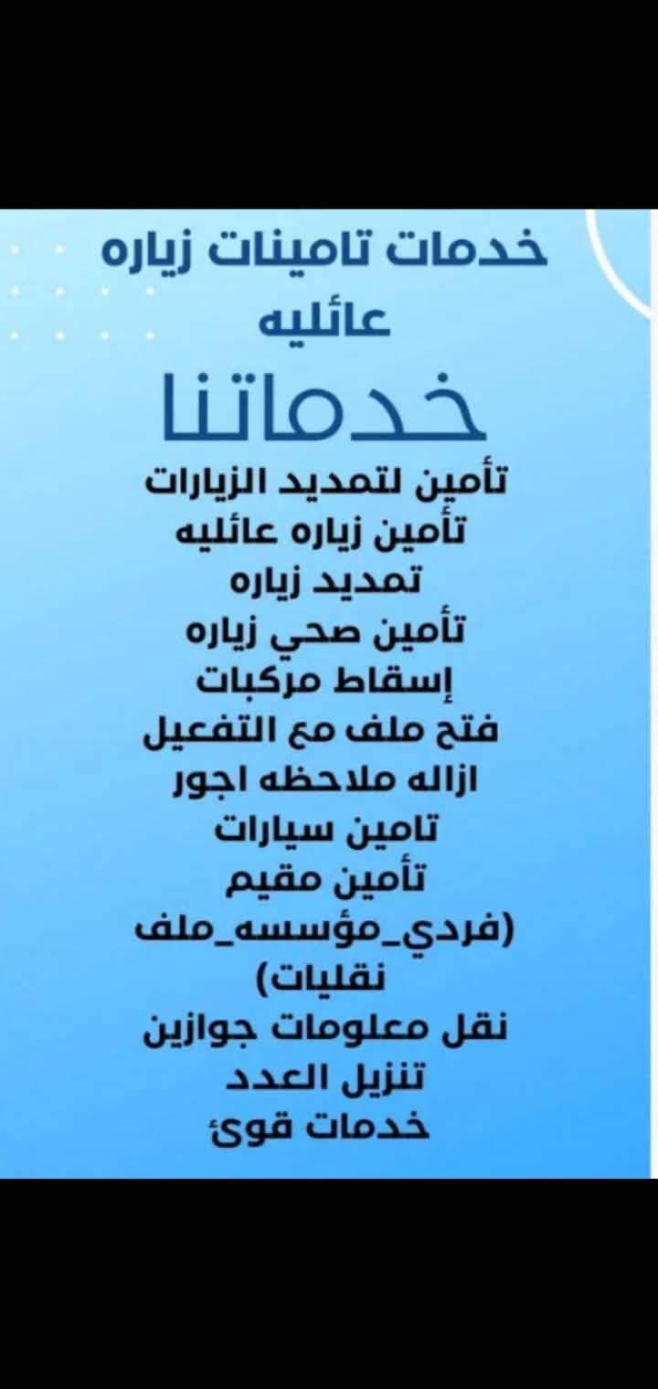 تأمين طبي أفراد مؤسسات شركات تأمين زيارات عائلية لغرض التمديد خصومات لكبار السن تأمين مركبات تأمين تابع تأمين مرافق تأمين زيارات لغرض العلاج. فك نسبة نقل فك نسبة اصدار. ازالة ملاحظة حماية أجور. كشف طبي اصدار إقامة كشف طبي اصدار رخصة تجديد زيارة ساري أو منتهى مؤقت منتي مؤقت ساري نقل معلومات تجديد كفيل طفل خروج وعوده