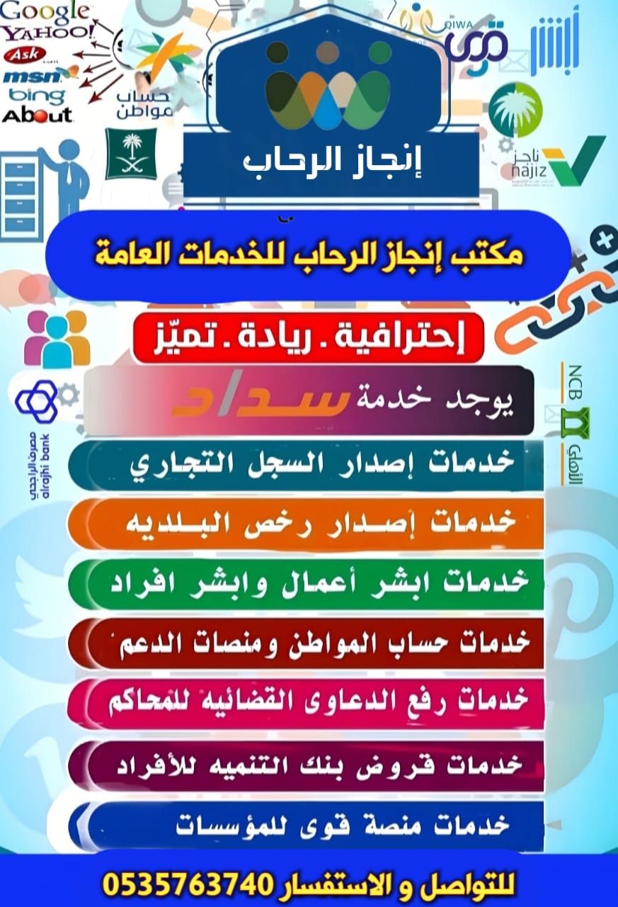 نحن مكتب خدمات عامة لجميع خدمات المؤسسات والأفراد ومراجعة الدوائر الحكوميه مثل وزارة التجارة ومكتب العمل واصدار التراخيص البلدية والسجلات التجاريه ونقل الخدمات للعماله واصدار التأشيرات للمؤسسات والأفراد