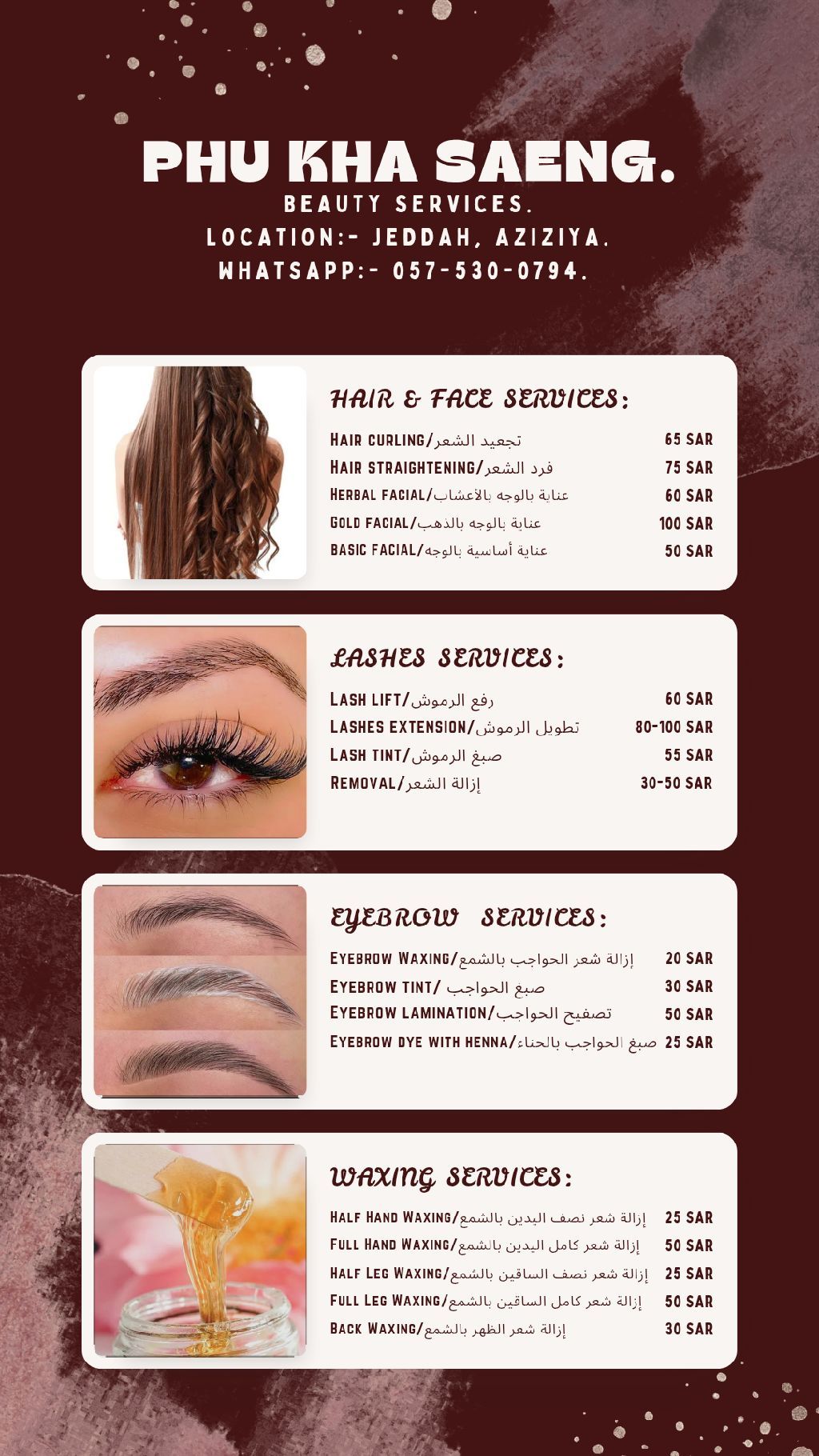Indulge in Beauty and Pampering A Comprehensive Look at Phu Kha Saeng Beauty Services in Jeddah This image showcases a detailed menu of beauty services offered by Phu Kha Saeng Beauty Services, located in the Aziziyah district of Jeddah, Saudi Arabia. The flyer is thoughtfully organized into distinct categories, making it easy for potential clients to navigate the array of treatments available