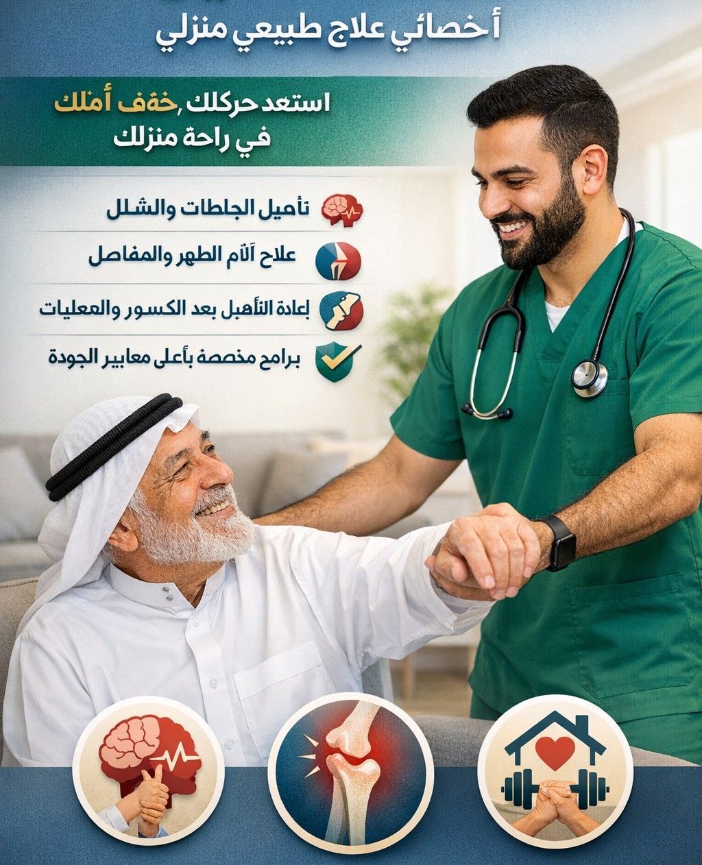 نوفر أخصائيين علاج طبيعي للرعاية المنزلية لكبار السن ومصابين الجلطات وألام الظهر والمفاصل
