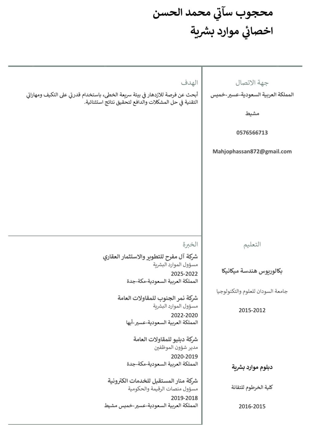 أخصائي مواد بشرية HR وخبرة كبيرة في الخدمات الالكترونية وقانون العمل السعودي والرواتب والحضور والانصراف وحوافز والخصم والاشراف علي الموظفين