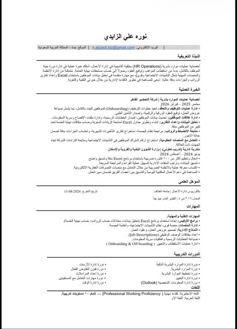 أخصائية عمليات موارد بشرية (نوره الزايدي) بكالوريوس إدارة أعمال. ابحث عن فرصة عمل في جدة أو الطائف (جاهزة للمباشرة) الخبرات إدارة المنصات الحكومية (قوى والتأمينات الاجتماعية) معرفة تامة في استخدام Excel متابعة البصمة والتأخيرات والغياب، وحساب نهاية الخدمة، صياغة عقودوا عروض عمل وإدارة التوظيف (Onboarding) دقة عالية في التقارير الادارية وسرية البيانات. التواصل عبر الايميل