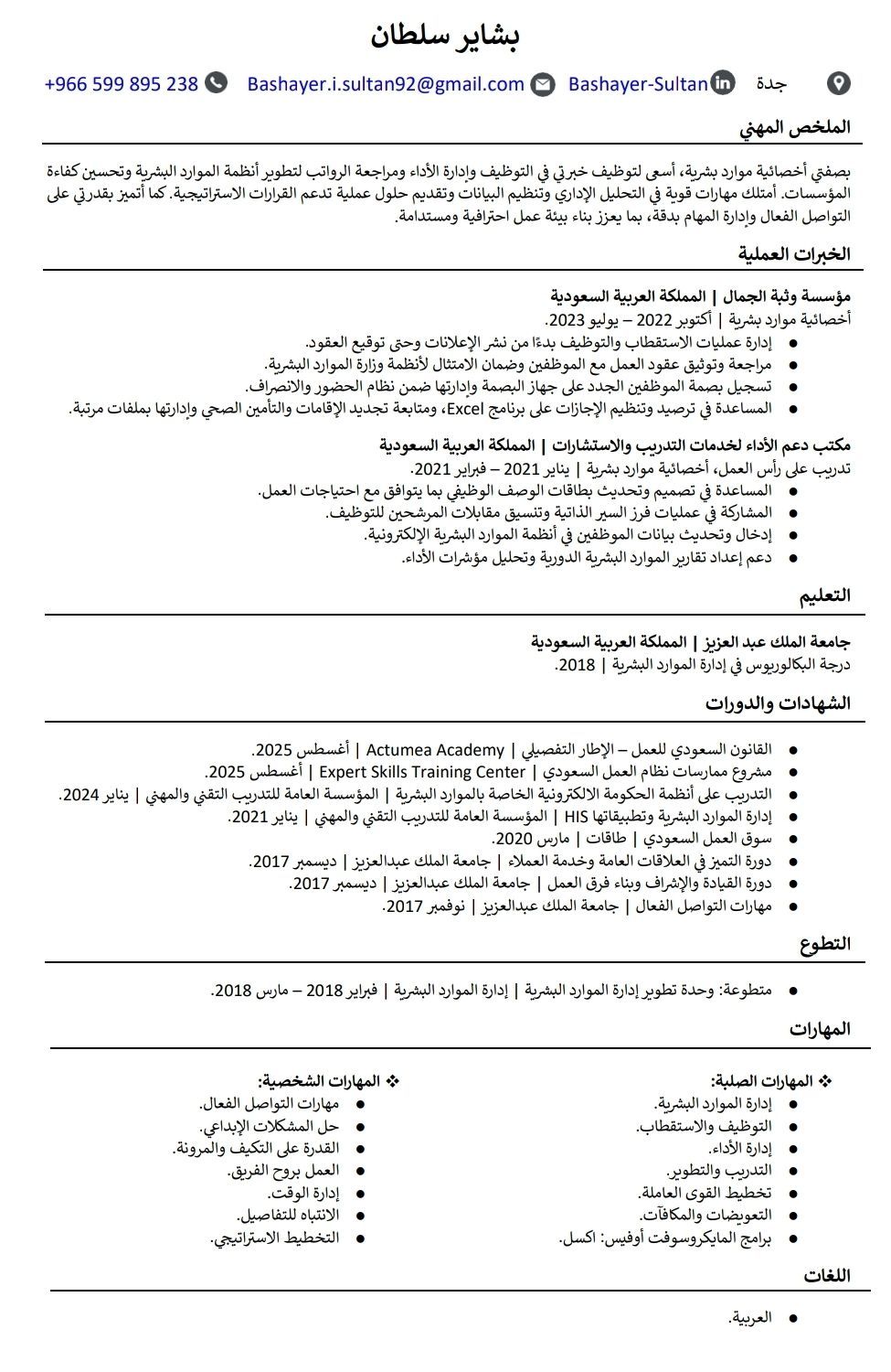 يسعدني التقديم على فرص العمل، أنا أخصائية موارد بشرية امتلك خبرة عملية في الاستقطاب والتوظيف، إدارة الرواتب والحوافز، متابعة الامتثال لأنظمة العمل السعودي، الى جانب اعداد تقارير الموارد البشرية وتحليل مؤشرات الأداء. كما لدي معرفة واسعة بالقانون السعودي للعمل وأنظمة الحكومة الالكترونية. أطمح للمساهمة في تطوير بيئة العمل وتعزيز كفاءة رأس المال البشري لديكم. أرفقت سيرتي الذاتية للاطلاع