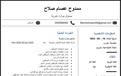 أسعد بالعمل كمساعد مدير موارد بشرية. بخبرتي التي تزيد عن عامان في المحاسبة والتقارير المالية ودعم الموارد البشرية، أعتقد انني قادر على تقديم مساهمات قيمة لفريقكم. خلال مسيرتي المهنية، عملت في كل من المملكة العربية السعودية، لدي خبرة في استخدام منصات حكومية مختلفة مثل ابشر وقوى ومقيم لدعم عمليات الموارد البشرية وضمان الامتثال القانوني. شكرا لاهتمامكم بطلبي. أتطلع الى المساهمة في مؤسستكم