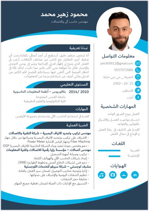 مهندس محمود بدران خريج هندسة جامعة سوهاج قسم اتصالات والالكترونيات بتقدير جيد جدا، ابحث عن العمل في مجال صيانة شبكات المحمول حيث أني لدي خبرة العمل بها من قبل في مصر أو في مجال الشبكات السلكية وأنظمة التيار الخفيف وكاميرات المراقبة أو في مجال ادخال البيانات حيث لدي خبرة ببرامج مايكروسوفت أوفيس مثل الورد والاكسل، أقيم حاليا في الرياض، إقامة سارية ومتاح نقل كفالة