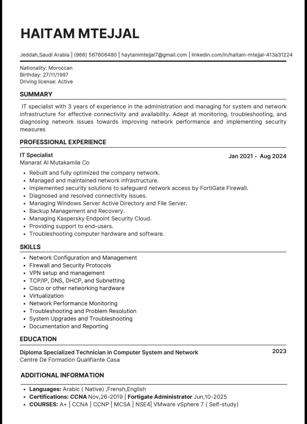 I am IT Specialist from Morocco with 3 years of experience in managing and configuring Network & System infrastructure adept at Monitoring network performance and troubleshooting network connectivity issues and securing the network to achieve the stability and continuity