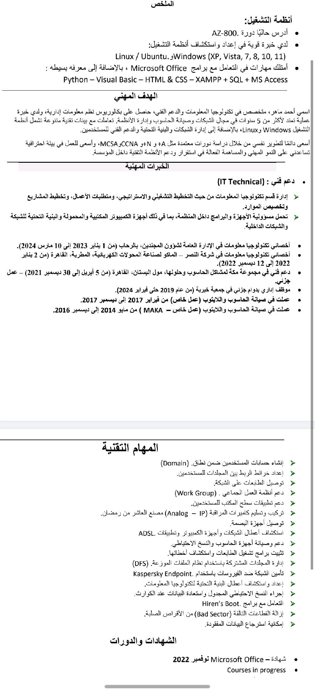 أحمد ماهر 27 عام مصري الجنسية خريج نظم معلومات عندي خبرة أكثر من 5 سنوات مصر وسنتين خبرة في المملكة في it specialist وفي حل مشاكل أل Hardware & Software اعداد الشبكات وتهيئة أل Routers وأل Switches إدارة Windows Serverg Active Directory، وضبط Fortigate Firewall والطابعات ومتابعة أداء الشبكة وحل مشاكل الاتصال وجاهز للعمل في جدة أو أي مدينة في المملكة